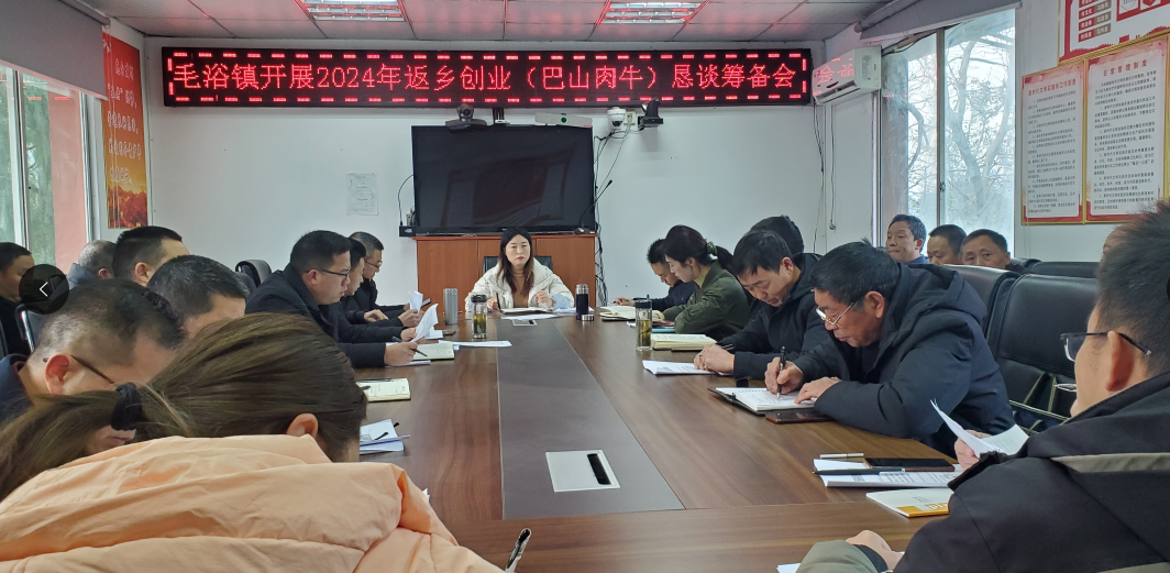 通江县毛浴镇2024年返乡创业(巴山肉牛)恳谈会,于2024年1月29日,毛浴镇党委政府以“同心话桑梓、聚力谋发展”为主题,组织召开2024年返乡创业(巴山肉牛)恳谈会。会议由毛浴镇党委委员、副镇长路少鹏主持,镇党政班子成员、镇相关部门、各村(社区)书记、副主任及感恩生态养殖专业合作彭仁荣等肉牛养殖成功人士、苟晗等返乡创业人士参加会议,会议宣讲了有关政策、传达了有关精神,与会返乡人士、养殖大户作了交流发言,朱丹镇长作了总结性讲话。